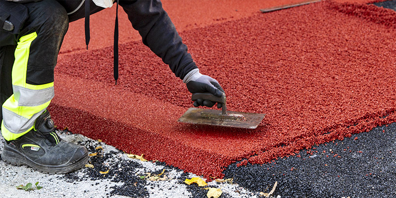 Fallskydd av gummi läggs i flera skikt.