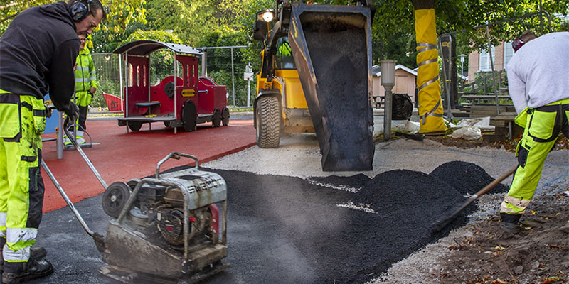 Först måste man förbereda för att montera lekutrustning, gjuta gummiunderlag, ibland asfalt och ibland konstgräs. Redan vid markarbetet är det viktigt att veta hur slutresultatet ska se ut för att kunna beräkna djup, bredd, positioner och fyllningsmassor.